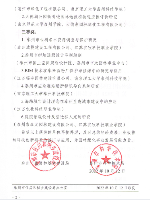 我公司庭院景觀項目獲得泰州市住建局、泰州市科技局園林綠化科技創(chuàng)新三等獎